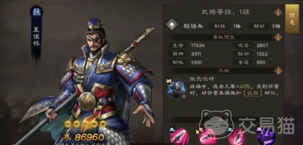 在他升级天赋属性后,能让连击的几率增加,兵刃伤害减免连击几率,也就是说夏侯惇在进行普攻时,可能再次触发一次攻击,对于魏国阵营来说,该武将时有额外的技能加成的,比如根据他额外的追击几率,再加一次兵刃损伤,这也就奠定了他十分强悍的“站撸”战斗能力,是绝大多数武将当中表现力非常突出的,很是强势,值得培养和选择。