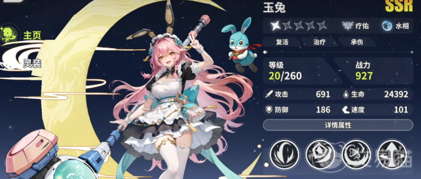 有了输出之后,自然不可缺少一个治疗位置。这里更推荐用玉兔,因为作为水相角色,可以通过治疗能力源源不断治愈队友。然后技能还有一定概率施加中毒效果,这样搭配起米迦勒也更容易输出了,然后还有一定的增伤能力。