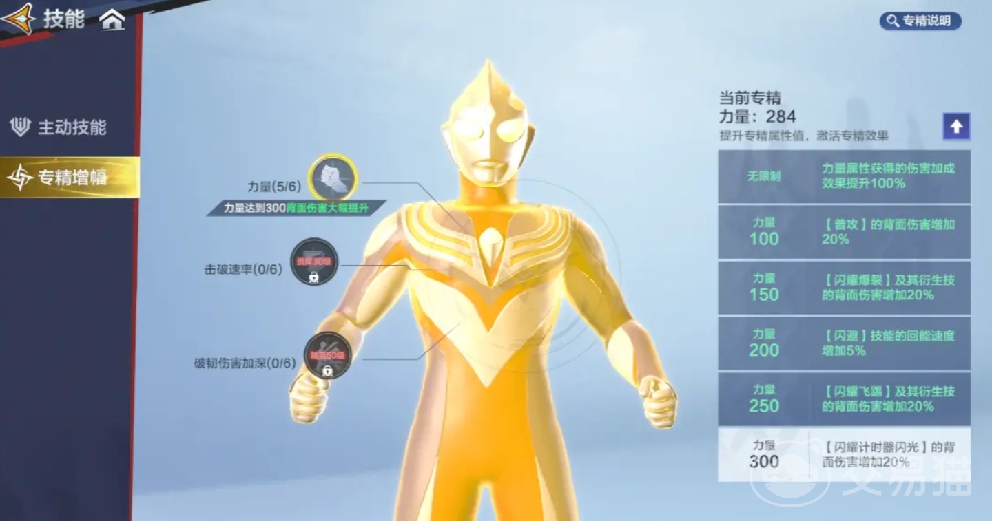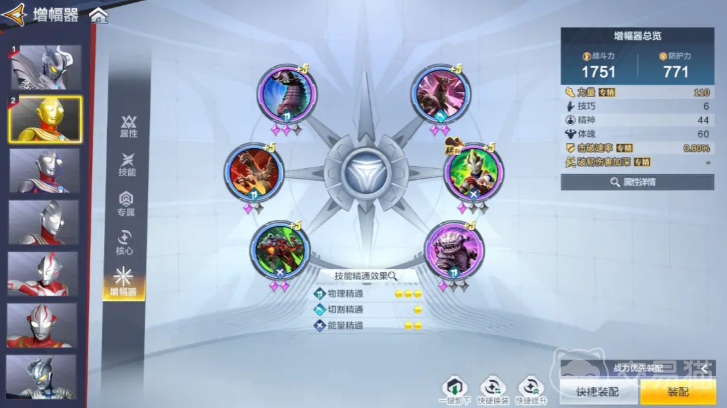 例如闪耀迪迦的专精词条是力量为主而终极赛罗则是以技巧为主,因此要根据奥特曼的这些专精属性,搭配相应的词条振幅器,当专精属性越高时,奥特曼还会触发专属效果提升,增幅器不仅有五种不一样的精通加成效果,分别是物理精通、打击精通、贯穿精通、切割精通和能量精通,而且这些精通效果与每个奥特曼的技能息息相关。