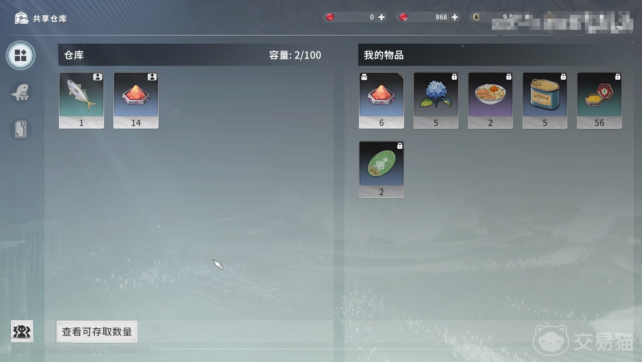 共享仓库的容量是100,所以存放是有上限的共享仓库打开之后,可以看到我的物品和共享物品,玩家可以左下角查看可存取的物品,有普通物品和珍稀物品,点开之后系统也会给予提示,比如普通物品有采集的、药剂等,那么从共享仓库中取出的物品也是有限的,普通物品50为上限,珍稀物品15为上限。