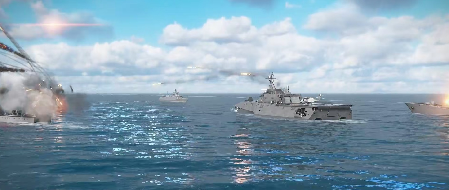 蓝鲨这艘史诗级的护卫舰因为在测试中直接赠送给玩家,所以也有着非常高的人气。蓝鲨作为外观非常科幻的护卫舰,通过直升机引导导弹可以隔山打牛,拥有两架直升机,两个可自由进行搭配的导弹槽,一座锁定主炮,和两具鱼雷发射器等,在武器方面非常全面。