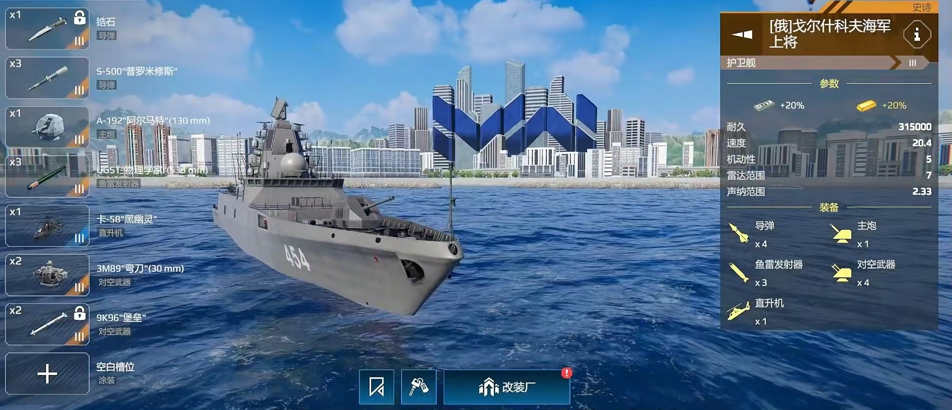 F126型护卫舰装备的火箭炮输出非常给力,搭配上A22型火箭近战表现良好,自身血量也比较高,是护卫舰中比较耐打的一艘,如果想要近距离作为冲锋船使用极为恰当。054A型护卫舰价格方面比较实惠,武器全面,拥有双火箭炮,双鱼雷的配置,在应对潜艇时有着很大的优势,是目前性价比非常高的护卫舰。乌沙科夫无论是防空、反潜还是近战以及远程等方面表现比较均衡,虽然没有特别亮眼的地方,但均衡就意味着适用很多战斗和地图,也很适合新手玩家刚刚进入高级房时,作为过渡用的主力舰船。