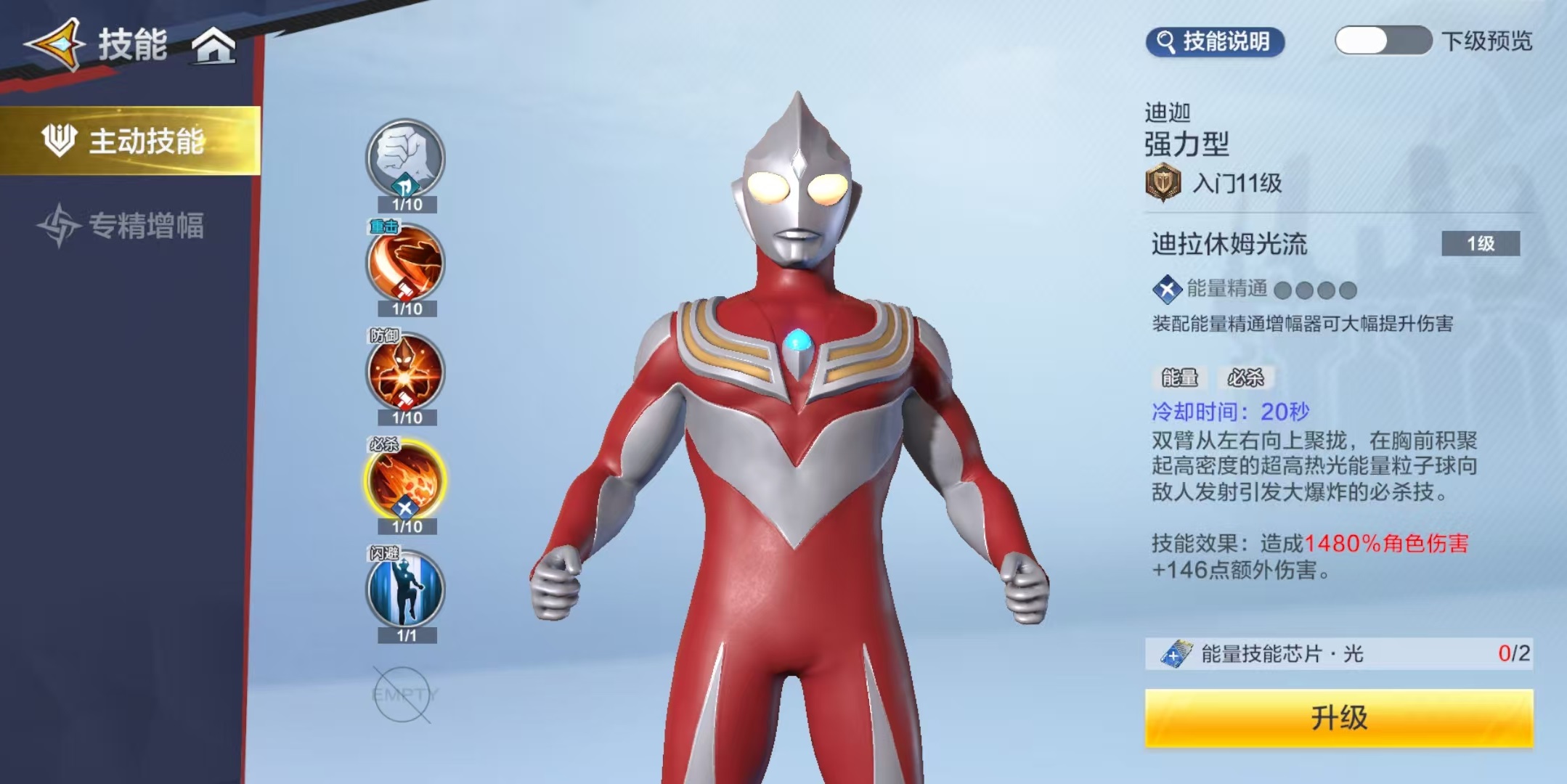 必杀技迪拉休姆光流,双臂从左右向上聚拢在胸前,聚集高密度的超高热光能量粒子球,发射出去后造成高额的伤害。大招通过后续装配能量精通增幅器,还可大幅提高伤害,是迪迦的真正杀招。