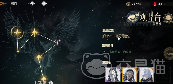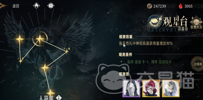 玩家可以选择优先拉满观星台的观测进度,如此就可以解锁更多轻松满足玩家在角色时的培养需求。不过目前观星台还会有一些限制,至今为止只开放到9章人马座。