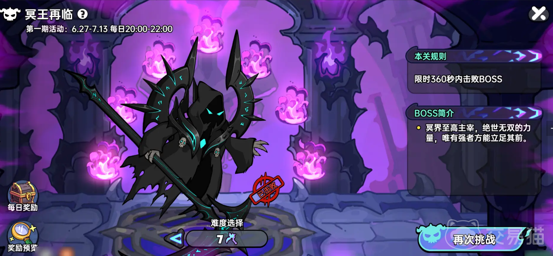 冥王再临简单来说就是个挑战boss的玩法,总共会有7种不同的难度选择,每提升一个难度,我们要面对的boss就会大幅度被加强,每一次成功挑战不同难度的冥王,就能获得对应的首通和每日奖励。