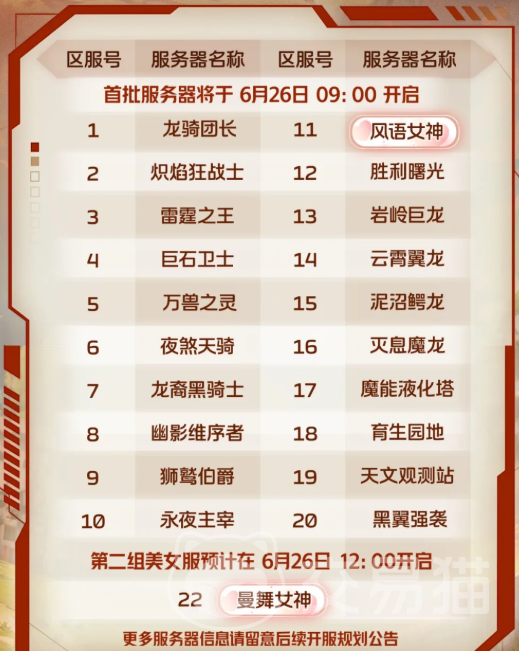 如图所示,游戏公测是6月26日,而首批服务器开启是在当天上午的9点,第一批一共有20个,其中11服和后续12点开启的22服都是美女服,有主播入驻对应服务器,如果有喜欢的主播可以考虑去对应服。