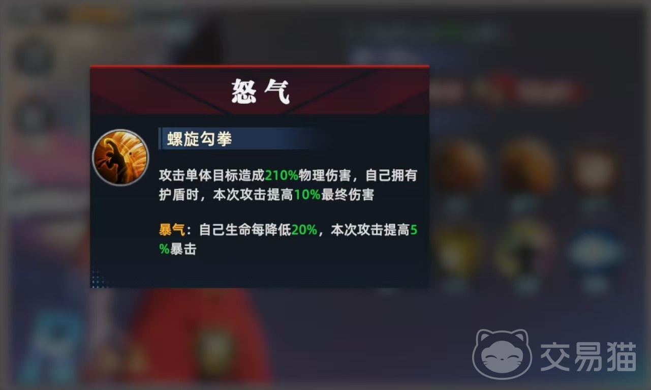 东丈在生命低于50%的时候直接触发爆气,提高5%最终伤害,持续两个回合,每次打出轻拳,都能获得200点怒气。必杀技攻击当前单体目标,造成物理伤害后,在爆气的强化下,生命每降低20%,必杀攻击就能提高5%暴击。怒气技攻击单体目标,造成高额物理伤害,当自身拥有护盾时,可以提高10%的最终伤害,在爆气强化下,生命每降低20%,本次攻击就能提高5%暴击。