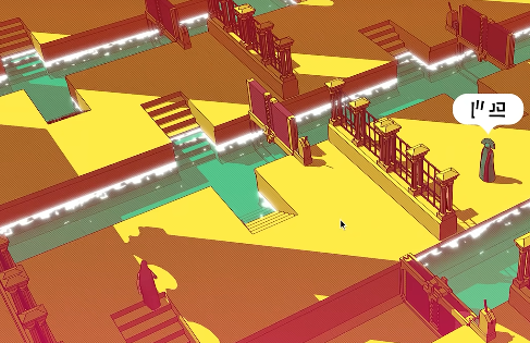 在完成小游戏找到他以后,他会带着玩家前往新的场景,这场景可以先将其称为场景1,在来到这里后可以看到几个店铺,在这些店铺中可以看到一个华容道类型的解谜,大家需要将里面放光的石头推出石盘,具体的方法就是将放光石头往下方去推,一直循环往下放,在放到最后就能推出来了。