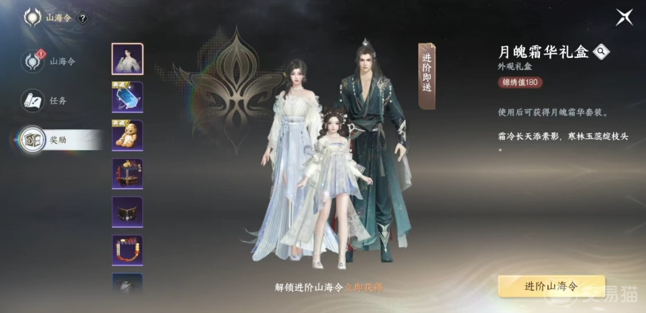 除了在珍宝阁中直接购买之外,游戏还会不定时的举办一些活动,完成这些活动后就可以获得时装奖励。例如在新区开服之后,各种各样的榜单靠前的玩家,都可以获得时装奖励,还有一些是通过特定商店兑换或者是成就系统来获得。还有一项是山海令这项活动中,购买了进阶山海令之后,就可以立即获得月魄霜华礼盒,打开之后获得月魄霜华套装,这已经属于性价比较高的时装了。