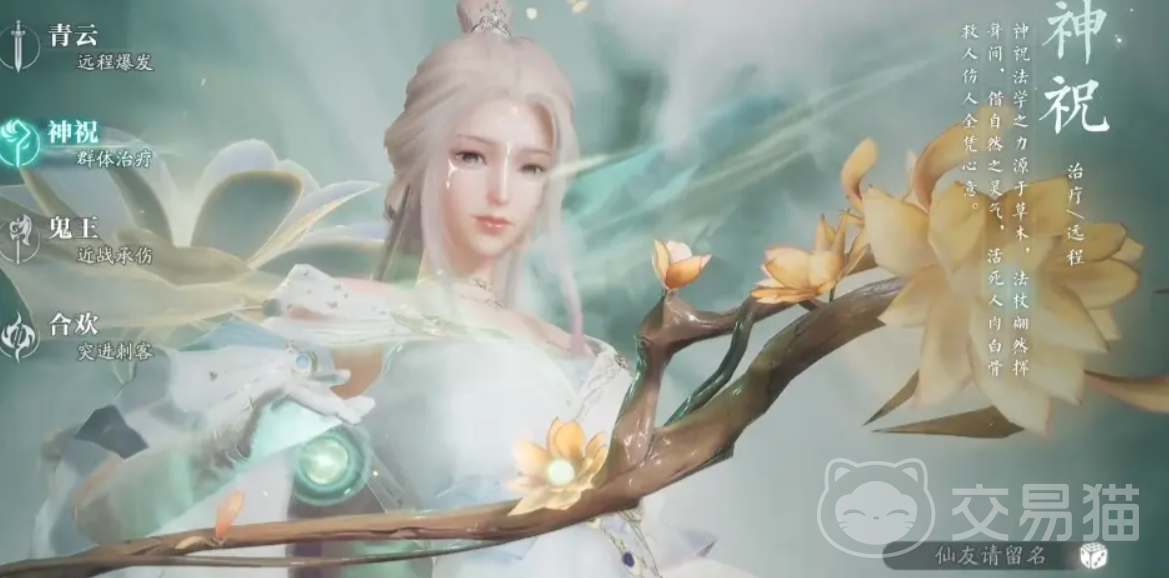 神祝是辅助类的,能靠着强大的治疗辅助能力来提升队友们的续航,使得队伍更加具有生存力,他的普攻会对敌人造成仙法伤害,每3次普攻会增加输出并回复灵力值,他的“花舞”能对周围敌人造成仙法输出并将他们给击飞,他的“花落”会给一位队友回复气血,并自动让范围内生命值最低的队友也得到回复,他的“竹影界”会展开一个向前方移动的竹墙,竹墙在不断移动的情况下会将对手直接撞飞,在墙体存在期间能帮助抵达敌人与飞行物,他的蓬莱在自身有60灵力值的情况下才能使用,释放时会解除掉身上的控制,并复活范围内所有重伤队友帮助他们回复气血。
