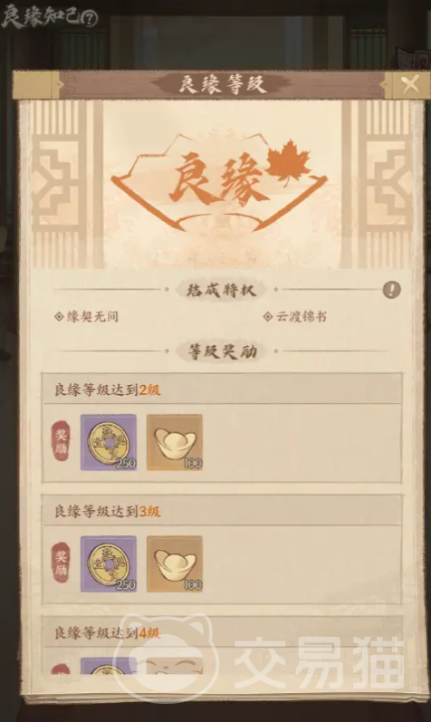 双方在成功缔结后,能获得各种特权,如知己上线提醒、专属知己等级、亲密度上限提升以及良缘手册经验共享等,除了特权之外,和自己的好友还可以通过互相赠送礼物、完成日常情缘任务的方式,来积累缘契值。