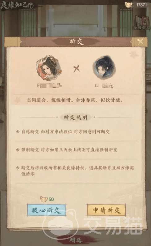 如果想要解除双方的知己关系,也非常简单,当一方离线超过一定时间后,就可以发起知己断交,只要对方同意就能直接解除关系,如果对方不同意,发起方野可以通过花费元宝的方式来强制清除,需要注意知己断交双方共同提升的等级清零,并回收所有称号和特权。