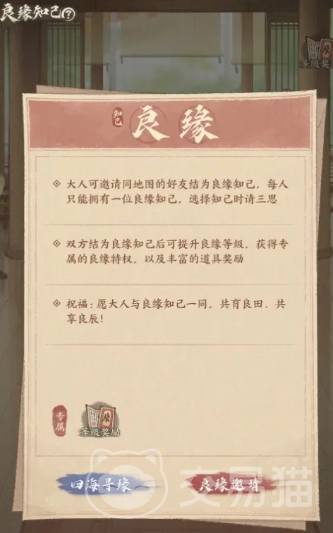 当大家的角色等级达到正八品下2阶,同时解锁知己轩建筑,就能开启“良缘知己”玩法,此时大家可以邀请同地图的好友结成知己,每一位玩家只能选择一位缔结,所以需要谨慎。