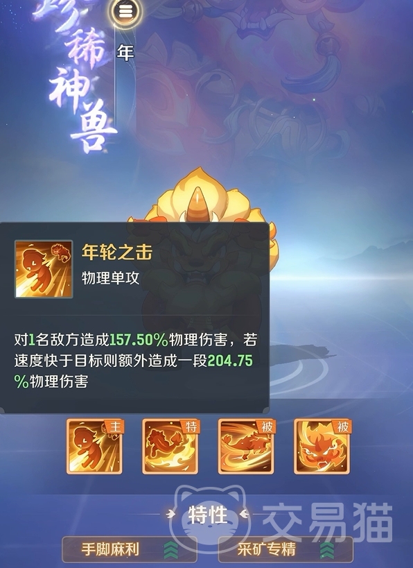 年兽的初始状态下共有四个技能。主动技为年轮之击,可对指定目标造成伤害,若年兽的速度快于目标,还能额外多施加一段攻击,很适合用来对付慢速敌人。特殊技为群攻技能,每次发动时会可对三名敌人造成一段物理伤害,若本次伤害触发了暴击,还能再额外多施加一段攻击。