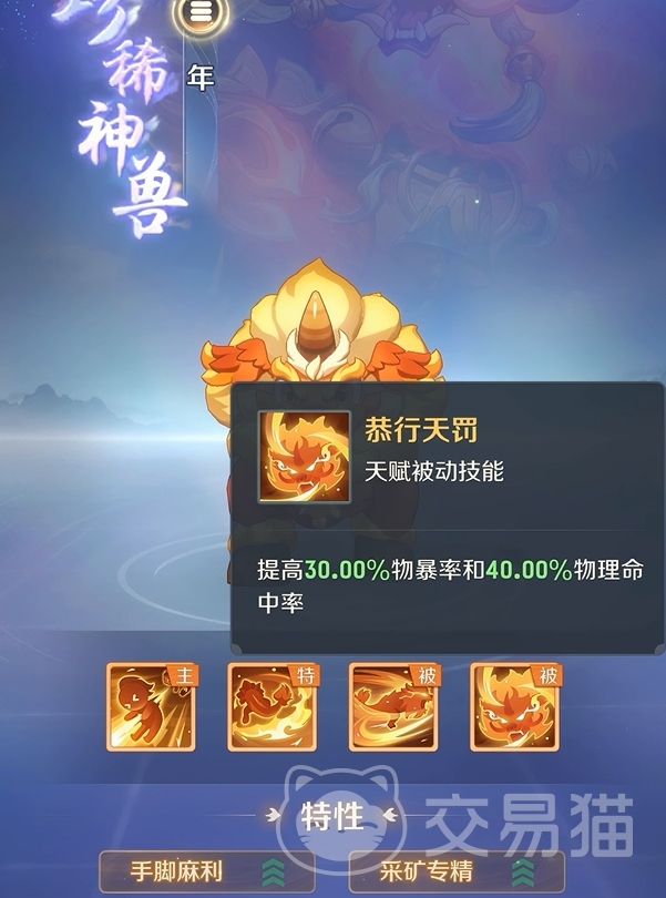 而在被动方面,年兽的两个被动技都能对它的攻击技能起到强化作用。其中第一个被动技八面玲珑可让年兽获得自身等级乘二的速度加成,令主动技的速度判定更容易触发。而第二个被动技恭行天罚更是能直接提升年兽的暴击率和物理命中,提高特殊技发动时能打出暴击的概率。