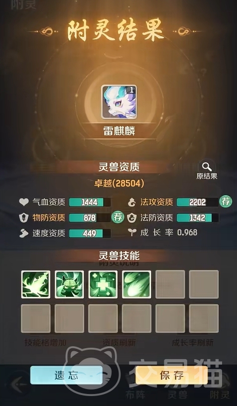 每一只灵兽只要满足绝世品质,就能无限次数地进行附灵,直到附灵出的结果达到玩家的预期为止。若是附灵后的结果还不如附灵之前,玩家也可选择遗忘,让主灵兽回退至附灵前的状态,但这样做依旧会消耗副灵兽。