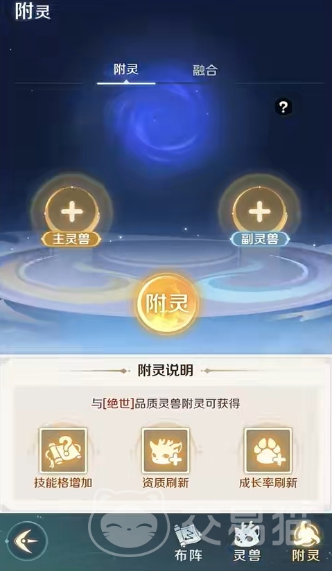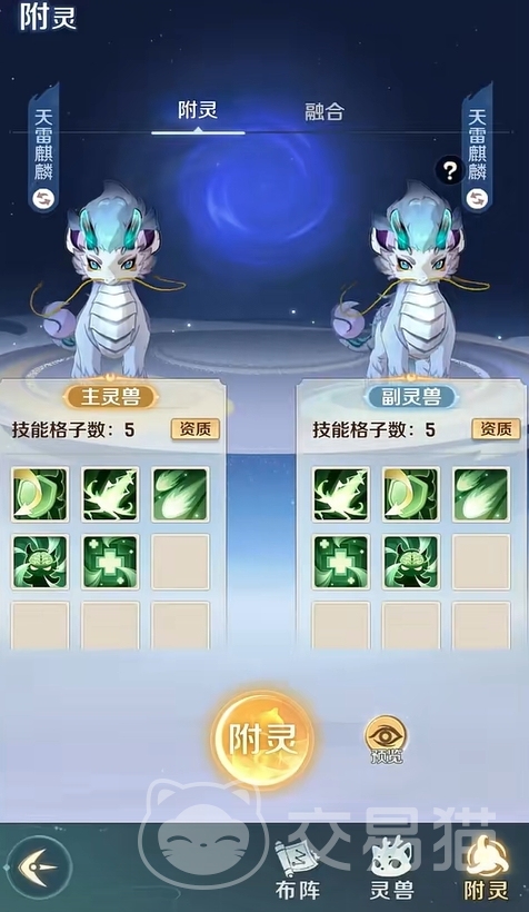 同时,主副灵兽在附灵前的技能数量越多,那么附灵后主灵兽可能会出现多技能的概率也越高,并且在主灵兽的技能大于等于8个时,附灵所需的副灵兽技能数量也要满足大于等于8个,且会在附灵时消耗额外的附灵露,该道具可在商店购买。