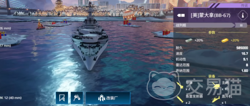 其主炮火力虽不如黎塞留猛,但胜在装填极快,四座三联装406mm主炮12秒一轮,辅以六座副炮持续打击,总伤害稳定且节奏紧凑。她的防空系统更是灵活多样,萨德系统、自由防空与高频自动炮的组合能构建出立体反导屏障,对抗战机与导弹均有不错表现。需要注意的是,蒙大拿舰体庞大、机动性低,容易在转场或撤退时被敌方集火。主炮布局为前二后二,也导致架点作战时经常出现部分炮塔被掩体遮挡的问题。更遗憾的是,其反潜能力薄弱,仅靠鱼雷难以对潜艇形成有效压制。