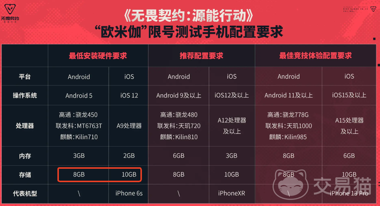 根据这次代号“欧米伽”测试给出的配置信息表来看,无畏契约手游安卓端的需要至少预留8gb的存储空间,ios系统设备则需要预留10gb的存储空间。安卓端考虑到还有安装包大小,建议预留更多的空间。