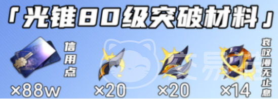 突破到80级只是培养白厄的第一步而已。接下来的问题是如何让她的光锥和行迹达到满级。为了这一目标,你将需要更多的信用点、经验书以及一大堆不同等级的材料。光锥和行迹的提升可不便宜,总共需要477万信用点。经验书方面,至少得准备290个大经验书。至于其他材料,提纯以太又得再准备166个,侵略凝块需要65个,阳雷的遥想需要12个,命运的足迹则是8个。哀叹漫无止境、狼牙这些也还得补充,不仅蓝色哀叹漫无止境要有76个,紫色哀叹漫无止境91个,金色哀叹漫无止境87个,狼牙更是需要22个蓝色、81个紫色、154个金色。光是这些材料,想想都让人头大。