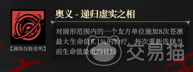 递归虚实之相:这是一个奥义技能,当战斗在进入到白热化的阶段时就可以使用。在使用时角色的身上就会散发一种柔和的光芒,以角色作为中心,形成一个治疗区域,在这一个领域内,每一个友方单位全部都会受到技能影响。这一个技能还会连续的施加8次治疗,每次全部都可以精准的找到一些生命值相对比较低的有方单位。