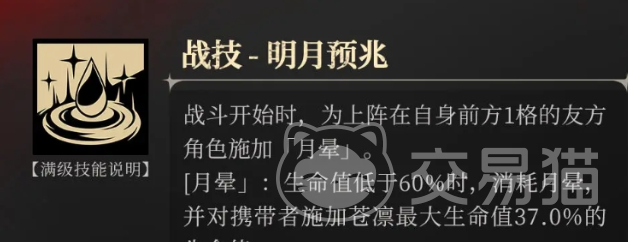 战技 - 明月预兆:战斗开始时就可以给友方的成员施加一个月晕效果。携带者的血量如果低于60%,那么就会直接触发月晕。消耗自身释放的强大治疗能量,治疗量基本上就是按照最大生命值来计算,大概是高达37%左右。