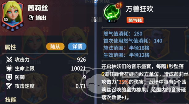 茜莉丝:属于一个后排输出英雄可以持续性的召唤辅助单位,帮助自己分担火力。怒气技能和场上的橡果数量有关,数量越多,则意味着所造成的威力也就越大。