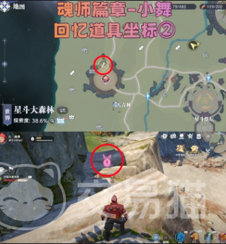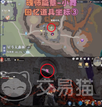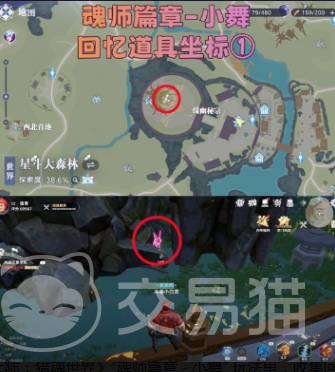 坐标①:位置是在星斗大森林的附近,这边有一个岩石凹陷处。玩家一旦在靠近之后就可以看到若隐若现的影子,一旦在触碰之后就可以收集回忆道具,玩家只需要接近即可解锁,没有复杂的操作。