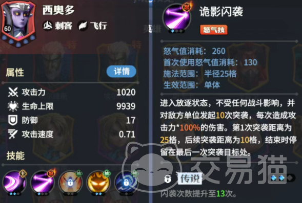 西奥多是游戏里的一个刺客,并且还具有飞行的设定,在对战的时候可以操控这个角色,快速移动到敌人身边,这时候能给对方带来大量的伤害,假如这个时候受到敌人的反击,那玩家受到的伤害是会减免的,在攻击的时候角色还可以把伤害转化成治疗,等于能够大幅度提升自身的生存,怒气技能名叫诡影闪袭,使用这个技能之后不会受到任何战斗的影响,,还可以直接向对方发起突袭。