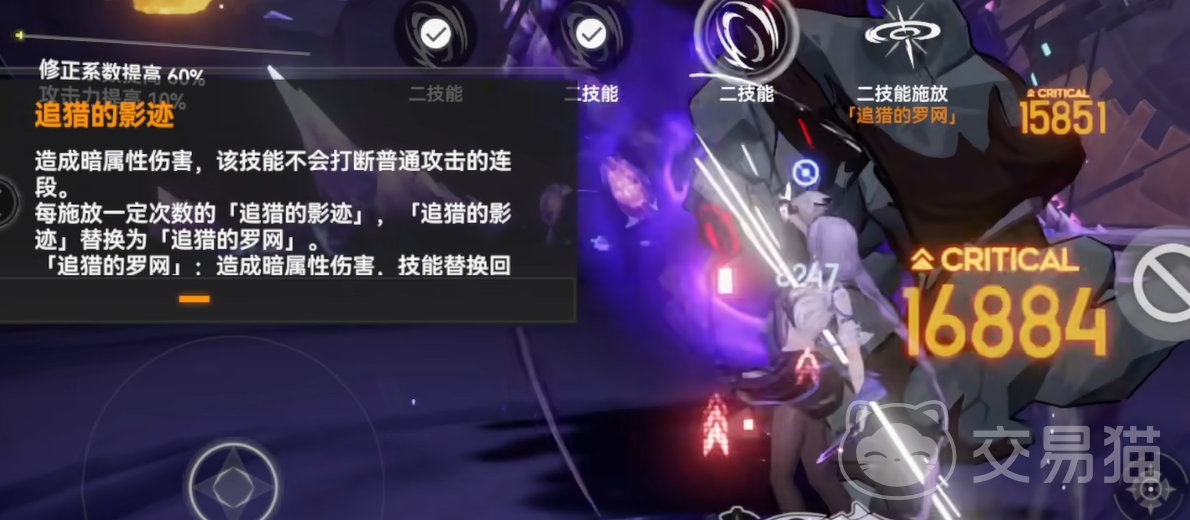 至于技能2“追猎的影迹”,这一技能设计巧妙,能够帮助塞尔凯特迅速切换战斗节奏。它的伤害是187.1%的暗属性伤害,并且可以不打断普攻的连招,使她的输出更加流畅。当使用三次后,她的技能会自动切换成“追猎的罗网”,这一技能不仅可以对敌人造成高达466.9%的攻击力暗伤,还能获取更多的标记,使她在后续的战斗中更具优势。