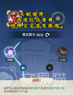 4、盘丝洞天赋建议选择曼舞和摄魄,左一天赋选择摄魄一,阎罗追命可以给目标造成气血上限的伤害,该天赋让盘丝洞也有了一定的输出能力。