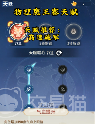 3、魔王寨魔王寨是一个物理输出职业该职业在天赋加点伤就比容易容了,可以把点数分配给攻击力、速度、防御力等天赋,若是点数还有多余的还可以提高一下控制抵抗属性。技能天赋的话优先升级破军,战斗时破军技能可以让玩家获得3回合的狼月,狼月能够增加物理攻击。
