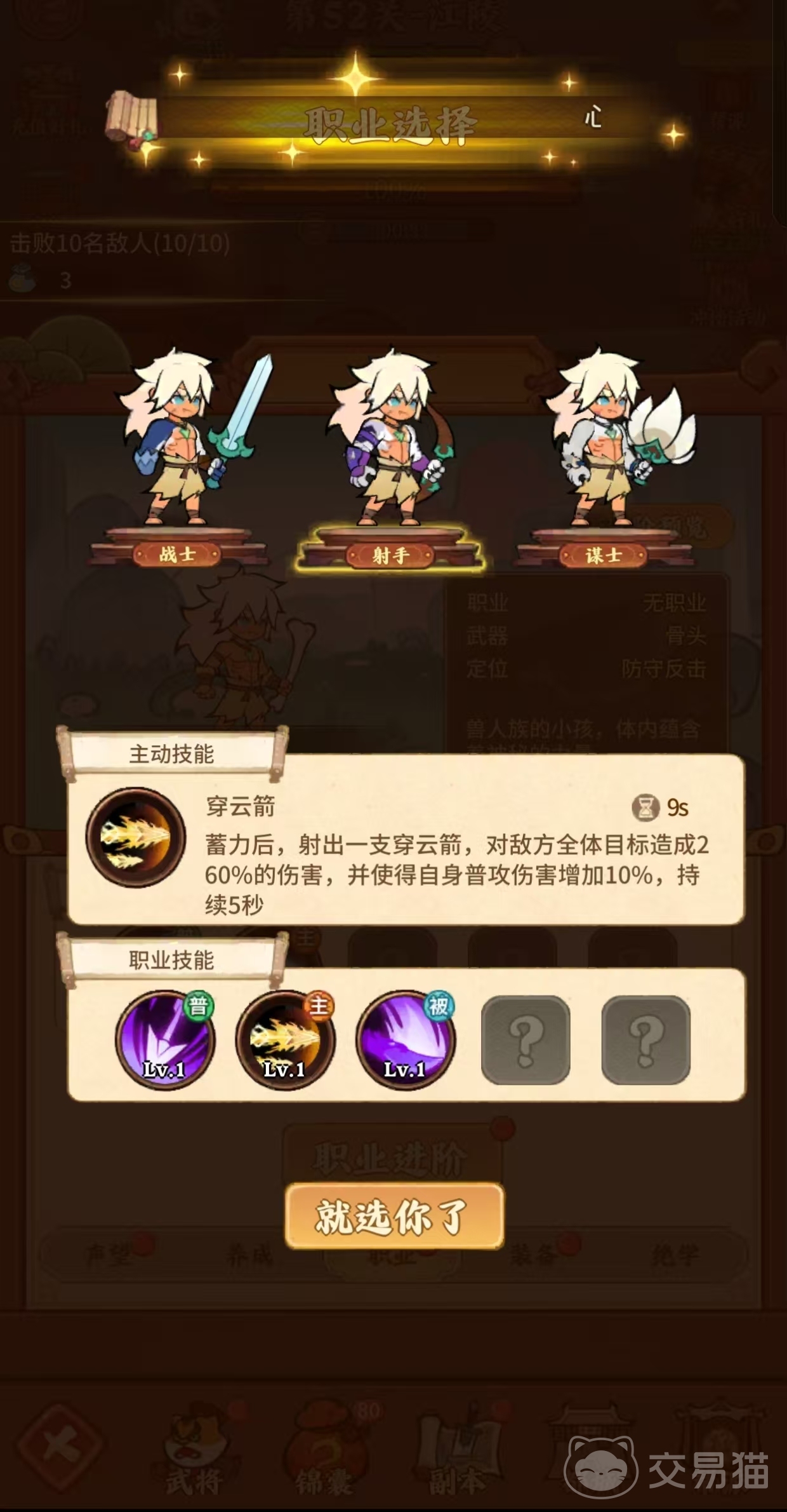 第二个射手职业,他们拥有极快的攻击速度和超高的暴击率,射手的普攻技能是单体远距离攻击,对最远的目标造成120%的普攻伤害;主动技能是蓄力后,射出一支穿云箭,造成巨大伤害;同时射手的被动技能是强化普攻,使普攻的伤害更高。所以喜欢策略和远程操控的玩家,可以试一试射手这个职业。