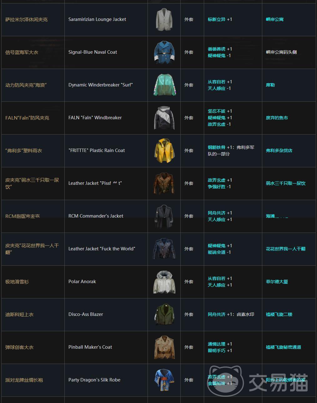 在工会的浴室中,玩家们可以获取到一个整洁的墨镜。戴上可使见微知著属性增加1点,故弄玄虚属性减少1点。在杂货商店的老板娘那里,小伙伴们可以买,或者偷到一个黄色的塑料雨衣,穿上可使钢筋铁骨属性增加1点。