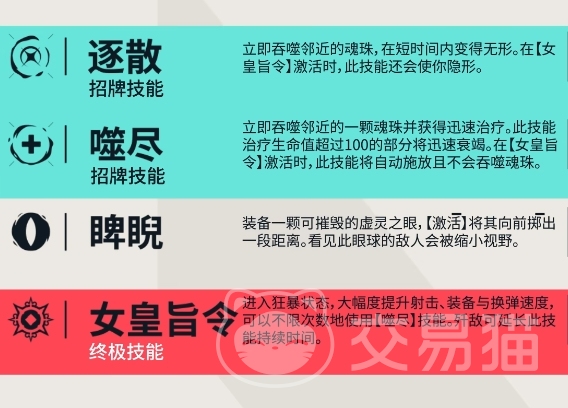 而另外一个能力噬尽是在产生击杀后用的,此时技能能够为芮娜回复一定量的生命值,每次回复量高达50,不过她的技能虽然好用,但是次数却受到限制,因为游戏中的噬尽和逐散的次数是放在一起计算的,综合起来都不能超过两次,噬尽的回复效果让芮娜能够在承受敌人攻击的同时,缺点就是使用技能的时候特效当中会有很明显的紫色光晕,所以大家当前的点位比较容易暴露。