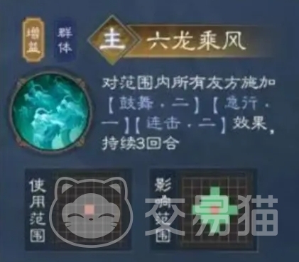 其主动技能六龙乘风,这是一项群体增益技能,当释放之时便能在特定范围内为所有友方将士赋予增益效果,其中有急行一、连击二等强力效果,且这些效果能够持续 3个回合之久,让友军在这一段时间内移动更为迅速,连击的概率也大幅提升。