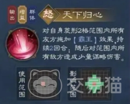 而天下归心作为曹操的群体怒气技能,同样有着非凡的影响力,它能够对自身菱形 2格范围内的所有友方施加霸王效果,持续 2个回合,让友军在这短暂而关键的时间内获得全属性的提升,随后又对范围内的敌人造成一定的谋略伤害,同时还能使友军获得鼓舞二带来的攻击与精神的小幅提升。