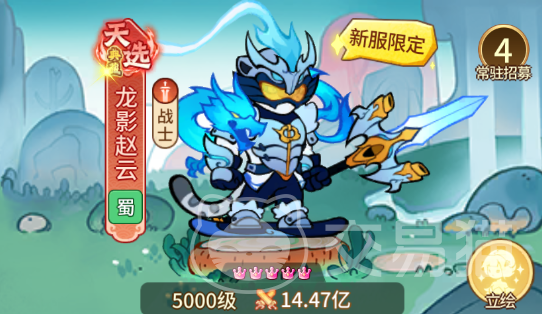 龙影赵云则是天选品级的新服限定的,战力要数倍与普通的赵云,也也更多,1个普攻1个主动技能外加3个被动。普攻直接是范围伤害,并且概率获得4秒伤害加深状态。主动技能“陷阵之志”,可以对最近的单位走造成最高1800%(14星)倍率的伤害,同时附加一个单挑标记,降低自身受到非标记目标70%(14星)的伤害,同时自己对标记目标攻击的时候获得30%暴击30%吸血50%暴伤加成,