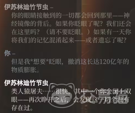 如果玩家在游戏过程中留意密码动物学家寻找稀有大竹节虫的支线任务,且主角在内陆帝国技能上投入足够点数,在最终找到凶手的小岛上,将有机会与神秘的竹节虫对话。竹节虫解释了其存在的目的与世界观,暗示它可能通过释放激素影响了逃兵的心智,促使其犯罪,竹节虫认为人类最终将因灰域斗争走向消亡,这可以看作是竹节虫对全人类的一种无形审判。
