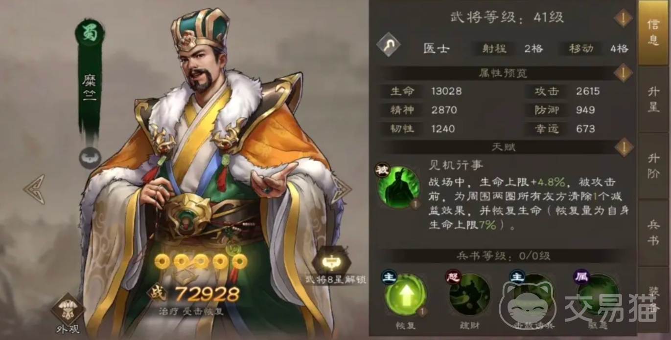 这里还有个小窍门,队伍里要是放上个糜竺,那也是过装备试炼的最优选择,糜竺这个武将轻轻松松就能升到8星,用完之后还能当做材料用,而且在蜀国阵营里,它也算是比较好用的平民角色了,放在防队伍里那是没问题的,不过大家要注意,在前期组队的时候,一定要重点养输出型的武将,尤其是那种单体输出高的,可别忙着去养肉盾。
