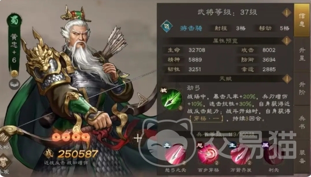 要是运气爆棚,手里有多余的魏延,也可以赶紧拉起来,这样阵容就能更加丰富多样了,一般来说都是可以凑出个关羽+张飞+赵云+刘备+糜竺这样的阵容,不过糜竺这个位置也挺灵活的,要是想换换花样,换成黄忠或者是关银屏也没问题,不过要是换的话,小编其实更推荐黄忠,黄忠可是五星蜀将,他所在的军团是弓骑兵,属性方面攻击力和精神属性都比较突出,虽然比不上关羽那么强悍,但也相当厉害了,技能上海自带20%的暴击加成和反击能力,就相当于他自带高暴击伤害,而且在敌方回合的时候还能进行防守反击,既能远程输出,又有着贴身作战的能力,也是跟蜀国阵容比较搭配的。
