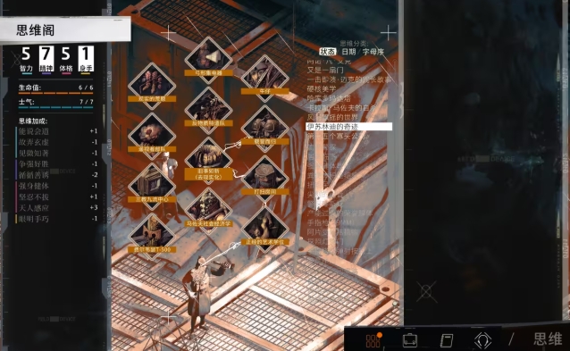 在游戏推进时,玩家会解锁各类思绪,它们会呈现在思维内阁中供玩家使用,思维内阁最多可容纳12个思绪,玩家需将思绪放置在菱形槽位来启用,这里要注意,思维阁的规划是决定玩家本局游戏玩法走向的关键因素,并且思维内化后可消耗技能点数遗忘,遗忘后无法再次使用,但在初期内化一些能给予经验、提升技能加点上限的思维是相当不错的选择,后期技能点充裕时,可将多余技能点用于更换增加数值的思维 。