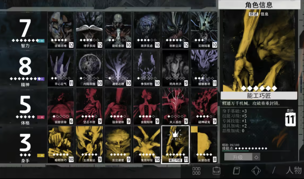 如果玩家自行创建角色,首先面临的就是属性分配,属性值范围为1至6点,玩家有8点自由属性点可分配,一般推荐智力优先点,能够解锁关键对话选项,像博学多闻、逻辑思维相关的检定,精神属性建议3至4点,看增强共情能力,体格属性3至4点,可以大幅提升生存能力,身手属性2至3点辅助探索,同时,玩家要从技能中挑选一个作为特长技能,建议参考常用技能。