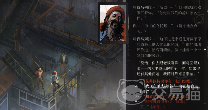 玩家通过对话得知,工会的领袖就在宿舍楼2楼,想要进入这里需要先和看守大门的角色周旋,可以直接用暴力的方式让对方开门,也可以趁着夜晚,去其他醉酒成员那里拿取门禁卡,但玩家需要注意的是,角色只有在白天才会出现在这个场景中,所以拿到门禁卡之后需要先等待夜晚结束。