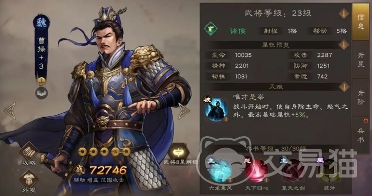 曹操作为游戏中的三大君主之一,也有着不错的价值,在游戏中,老曹、刘备、孙权这三位君主都属于辅助型将领,毕竟在曹操传中,系统赠送的老曹不仅容易获取,而且在升星方面也相对简单,这也使得他成为了众多玩家的初始选择之一,在实际战斗中,曹操的作用是能为队友施加增益辅助效果,而且曹操自身比较肉,拥有一定的坦度,经常能够在战场上坚守到最后,为队友承担伤害,提供稳定的保护,当然在输出方面就不能过于指望他了,但在五人阵的体系中,他作为辅助角色的存在还是可以的,有时候甚至需要他挺身而出,前往前排抵挡敌人的攻击,为后排的输出位创造良好的输出环境。