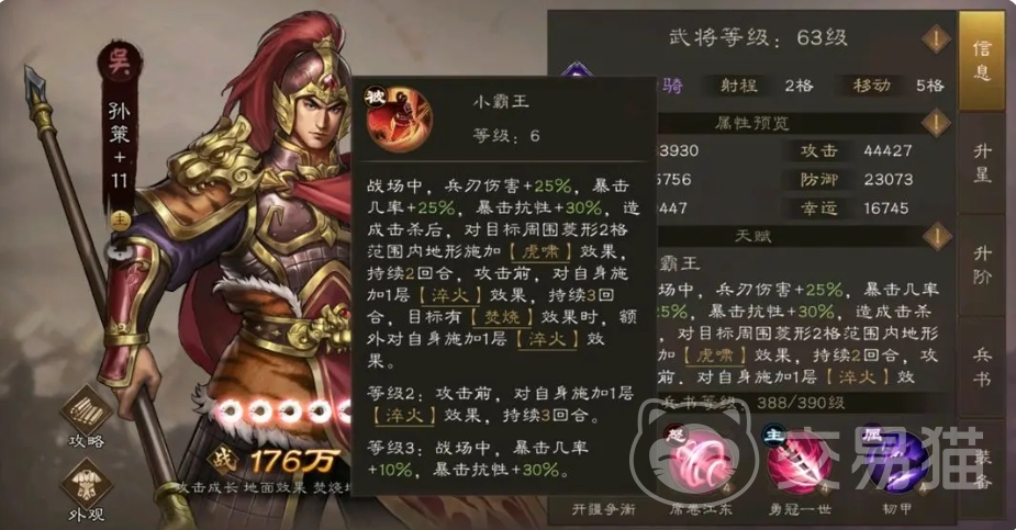 孙策同样是一位实力非凡的武将,在战场中他自带兵刃伤害+25%、暴击几率+25%以及暴击抗性+30%的强力属性,并且在成功击杀敌人后,还能够对目标周围菱形 2 格范围内的地形施加虎啸效果,持续2回合,此外孙策在攻击前还会对自身施加1层淬火效果,持续3回合,而且目标每有1层焚烧效果,他便能额外对自身施加1层淬火,孙策的被动属于攻击成长性被动,需要攻击携带焚烧减益的角色才能实现快速成长,然而孙策自身施加焚烧效果的能力相对较弱,且多为单体攻击,所以这就需要队友协助他大范围地施加焚烧效果,在这方面孙尚香、鲁肃、黄盖等武将都具备范围施加焚烧的能力,他们与孙策相互配合,能够形成良好的战斗联动。