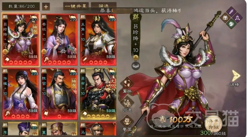 最后来说说吕布,他在PVP模式中拥有无视防御特性,其大招在成功击杀敌人后,不仅会对周围造成范围伤害,还会附加恐慌效果,正因如此吕布在PVP模式中属于纯PVP武将,此外在沙盘推演这一玩法中,吕布也有着不错的效果,尤其是在高层数的挑战中,他能够帮助玩家获得高等级兵书,从而为武将的成长和实力提升带来优势,吕布的大招攻击范围广泛,还具备混乱敌方的效果,然而让许多玩家感到无奈的是,尽管渴望得到吕布,但很多时候即便快抽到 300次了,却依旧难以抽出一个吕布,这也使得目前吕布在游戏中的获取难度较大,成为了众多玩家心中又爱又恨的存在。