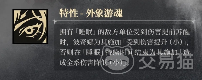而波奇娜的特性叫做外象游魂,当拥有睡眠效果的敌方单位因受到伤害提前苏醒时,波奇娜会迅速为其施加受到伤害提升小不分的效果,持续6秒时间,让敌人在接下来的战斗中承受更多的伤害,削弱其战斗力,反之如果睡眠持续时间正常结束,波奇娜则会为敌人施加造成全系伤害降低小不分的效果,持续6秒,也可以限制敌人后续的输出能力。