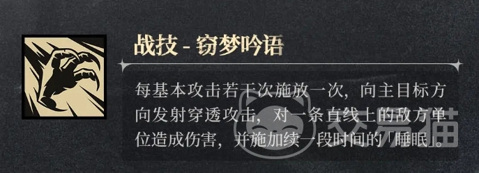 游戏中的波奇娜每进行 4次基本攻击后,便会主动使用战技,此时带来贯穿目标的攻击数值也是不错的,可以对敌人造成攻击力200%的法术伤害,且这道攻击还会对沿途命中的所有敌方单位施加睡眠效果,让敌人在毫无防备的情况下陷入沉睡,持续时间同样为 4秒,这也在一定程度上扩大了技能的控制范围和战斗影响力。