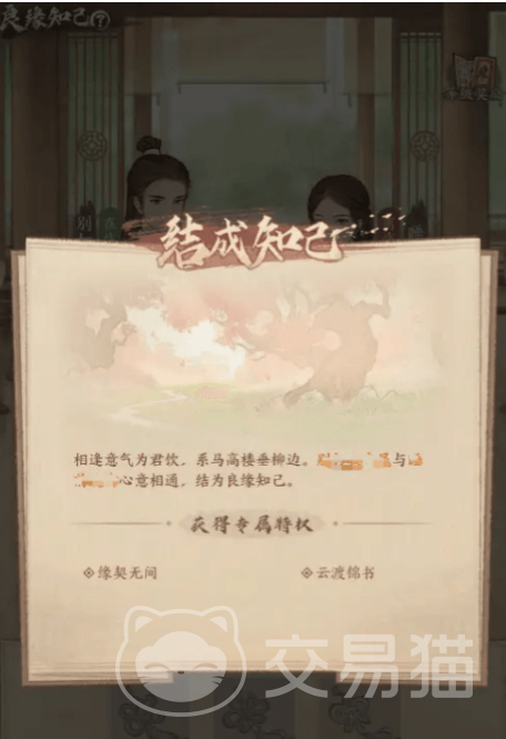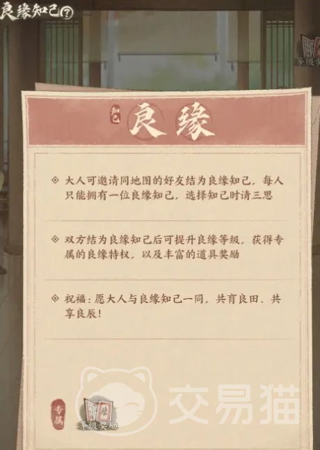 成功结为知己后,你和朋友将拥有一系列独特的特权。首先,你们将享受彼此上线提醒,绝不会错过任何一个共同奋斗的机会。除此之外,你们的亲密度上限会提升,专属的知己等级也会随之而来,还有良缘手册的经验共享,让你们的成长更加迅速。除此之外,你们可以通过互送礼物和完成情缘任务来积累缘契值,这些都将直接关系到后续能够解锁的奖励。